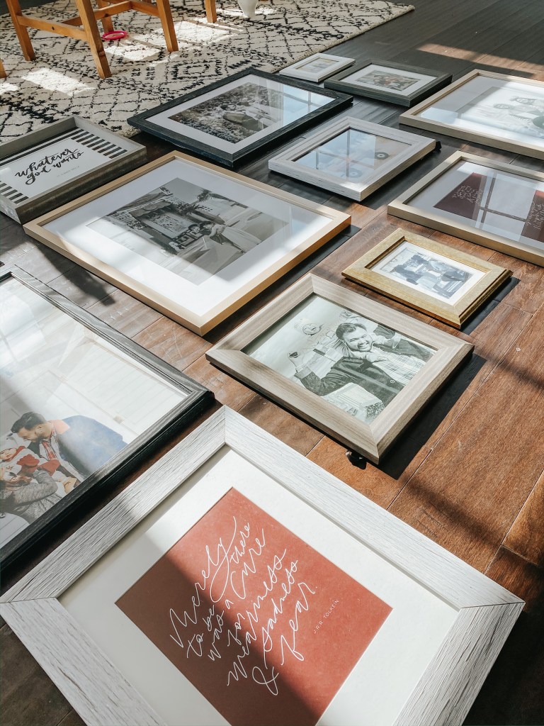 If you’re wondering first what kinds of frames to purchase, that’s entirely up to your preference. The new frames were in addition to the other frame types we have already collected through the years, and the colors were drawn from other colors & textures already present in our family room. We went with the barnwood (distressed natural + white), gold, and black combo.