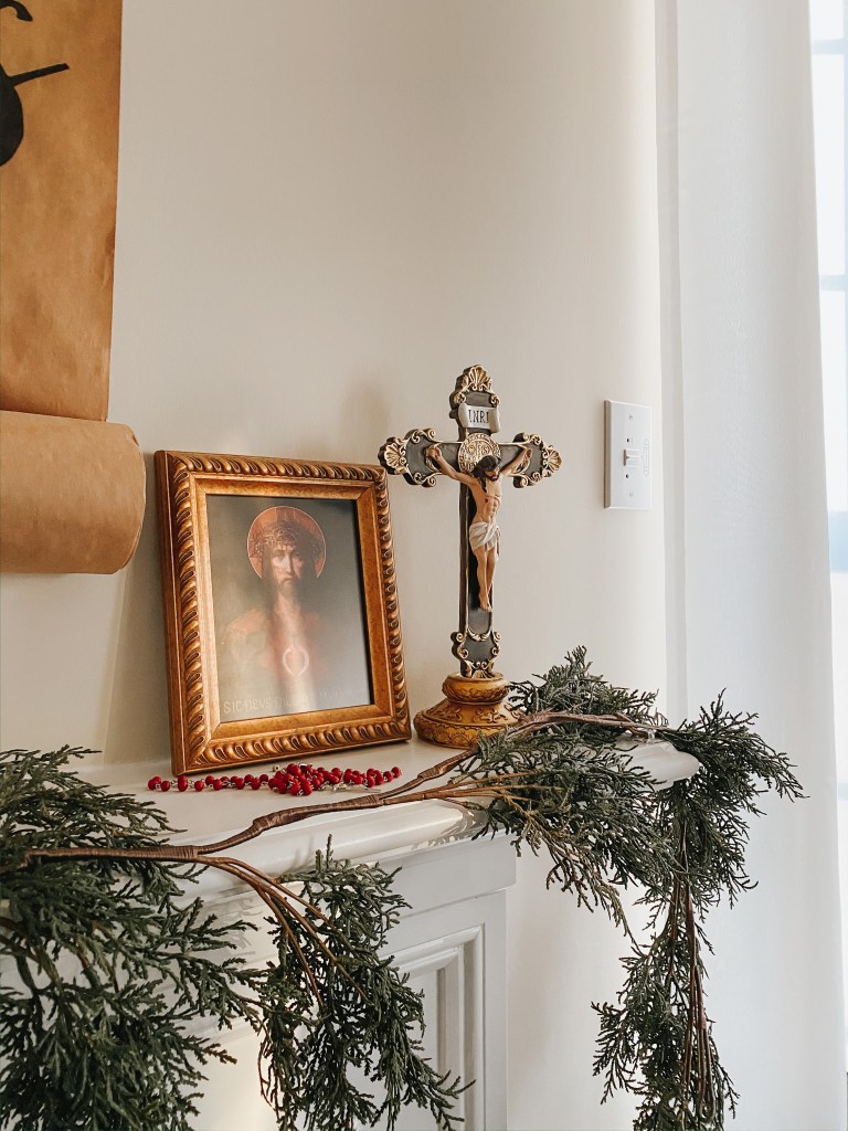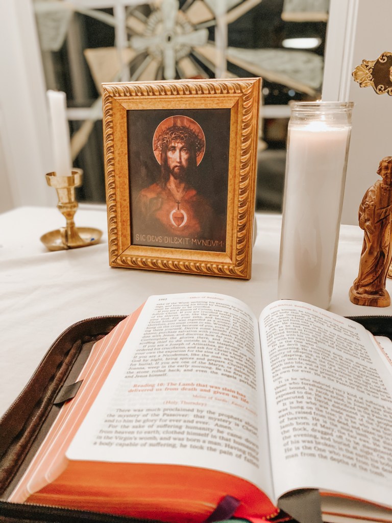 Sacred art is a great gift to the Church for it provides us to come into deeper prayer with the Gospel and even the mystery of the Eucharist in ways that perhaps words couldn’t explain. Each day of Lent I make an effort to stare at this image of the Sacred Heart of Jesus on my mantle for a moment. His thorn crowned brow. The tears on His face. The Eucharist Host behind His Sacred heart, enflamed with love for us…