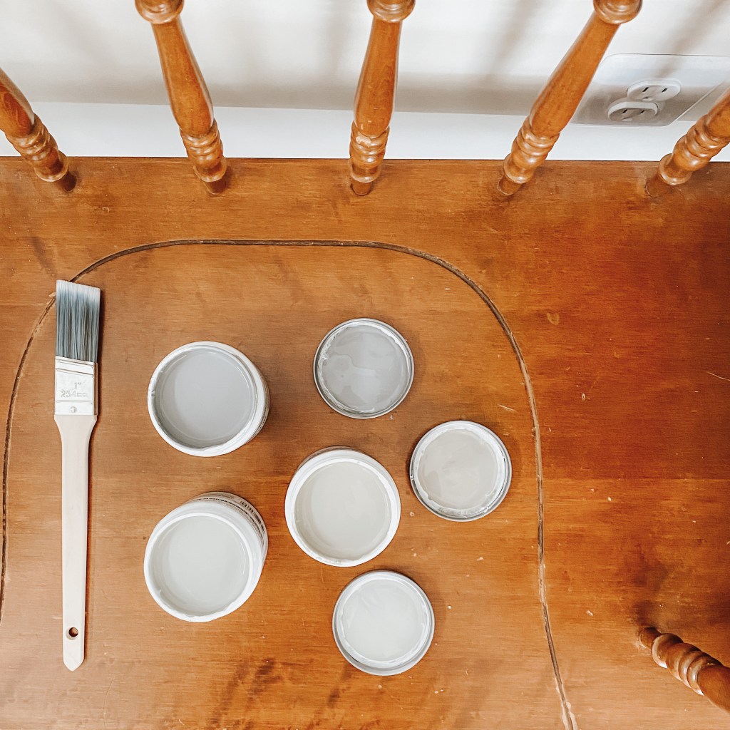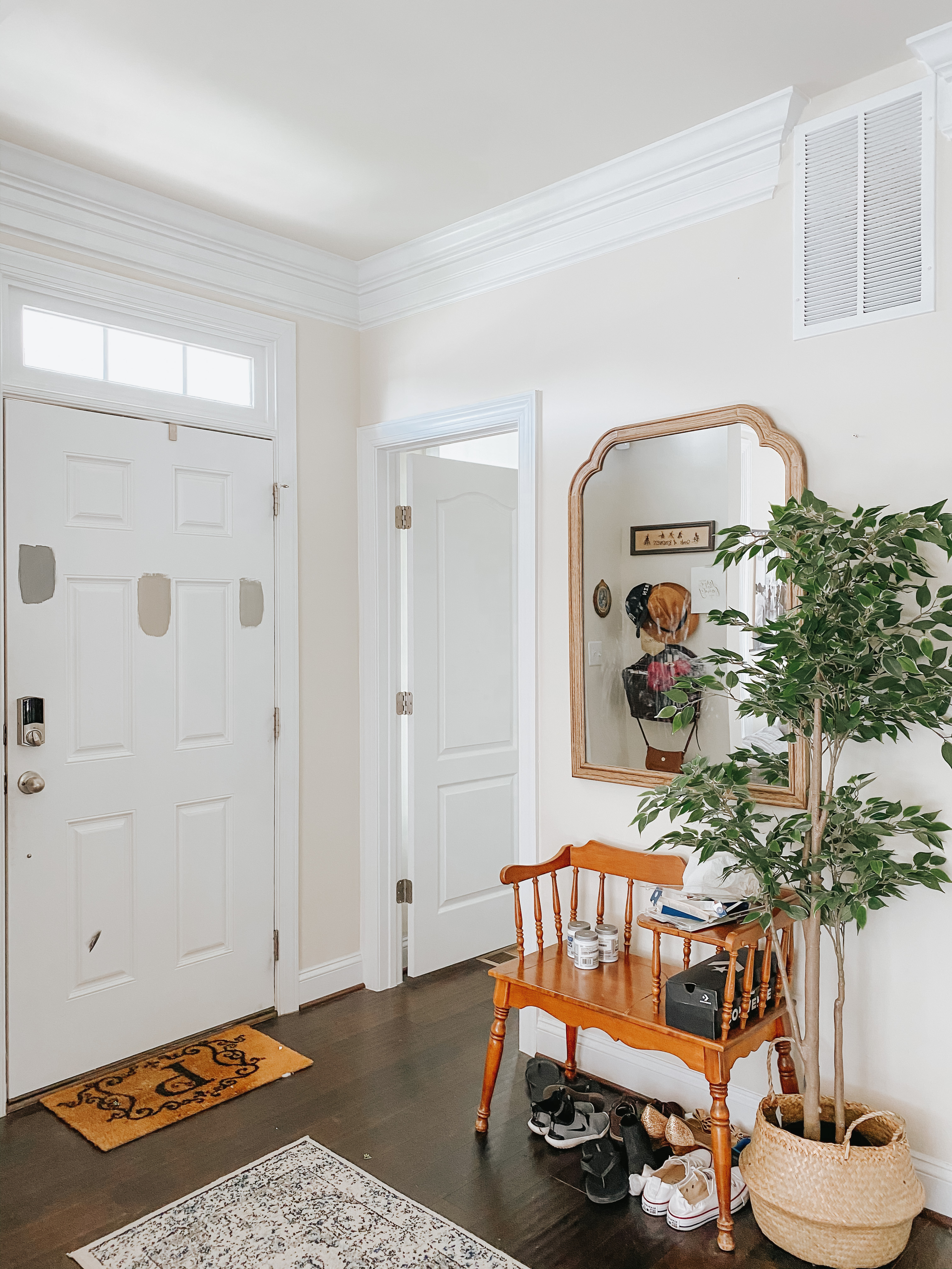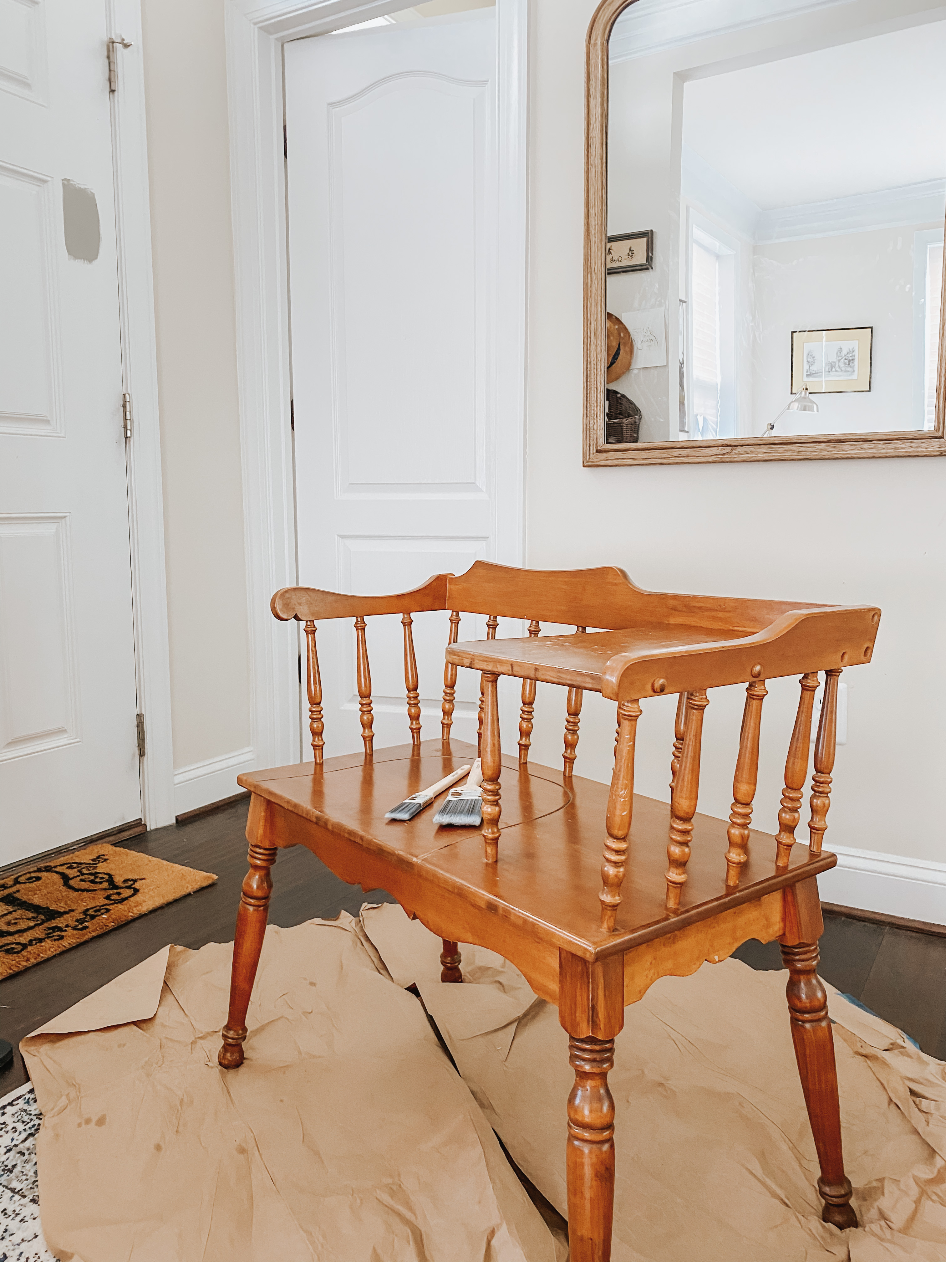 After putting together a little mood board, I realized that with our dark floors, the rug I selected, and the color scheme in place, painting the vintage telephone bench came to mind as well. When I first purchased it off of Facebook Marketplace two years ago, I wanted to keep it as is. But then when I put all the pieces together and looked at the wood frame of the mirror, the different wood felt too conflicting for me. When I closely focused on the space as a whole, I knew painting it would provide cohesiveness. (FYI: I used the little sample paint from the color that we didn’t select for the door.)