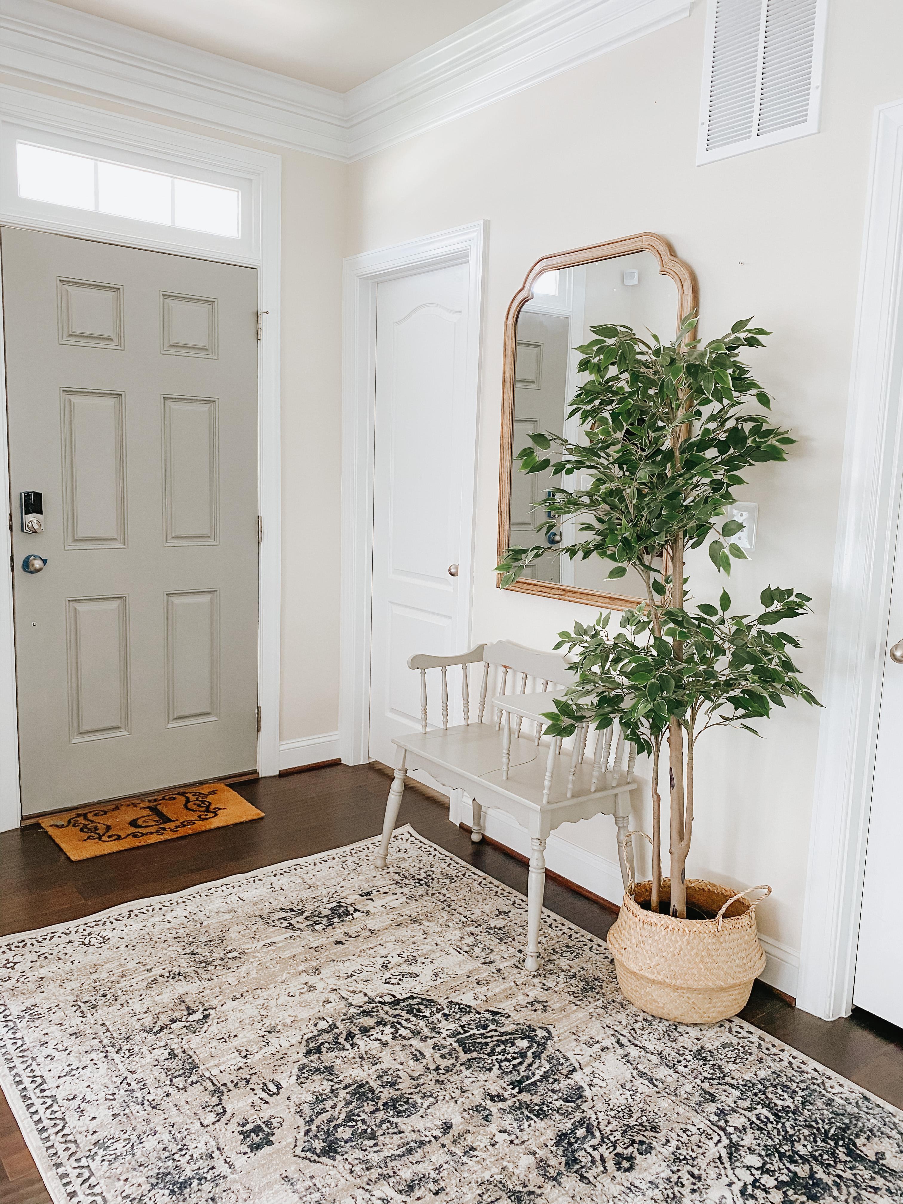 - I left the little doormat right as is to capture most of the dirt upon entering so that this low pile rug wouldn’t get the brunt of it, though we always ask our guests to remove their shoes anyway. This size is also great because it extends to the mud room entrance (door to the right of the tree) as well, so there’s a size + practical win right there.